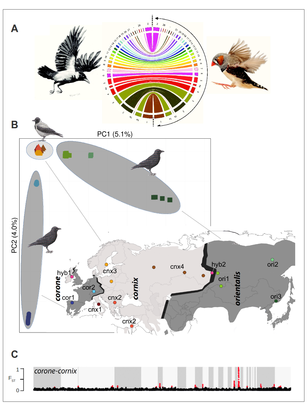 Hybrid zones have long been a central locus of speciation research, and are commonly characterized as “natural laboratories of evolution” or “windows into the evolutionary process.” One reason for this is that hybrid zones capture an intermediate stage of speciation, in which reproductive isolation is present but incomplete. A hybrid zone between partially grey (Hooded) and all-black (Carrion) crows in Europe had already been mapped by 1928 (Meise) and was discussed by as a key example of speciation and hybridization by Ernst Mayr mid-century — and subsequently in several modern textbooks on evolution. However, little research had been conducted on this system and had perhaps raised more questions than answers, such as the intriguing finding of an apparent lack of (neutral) genetic differentiation between them.